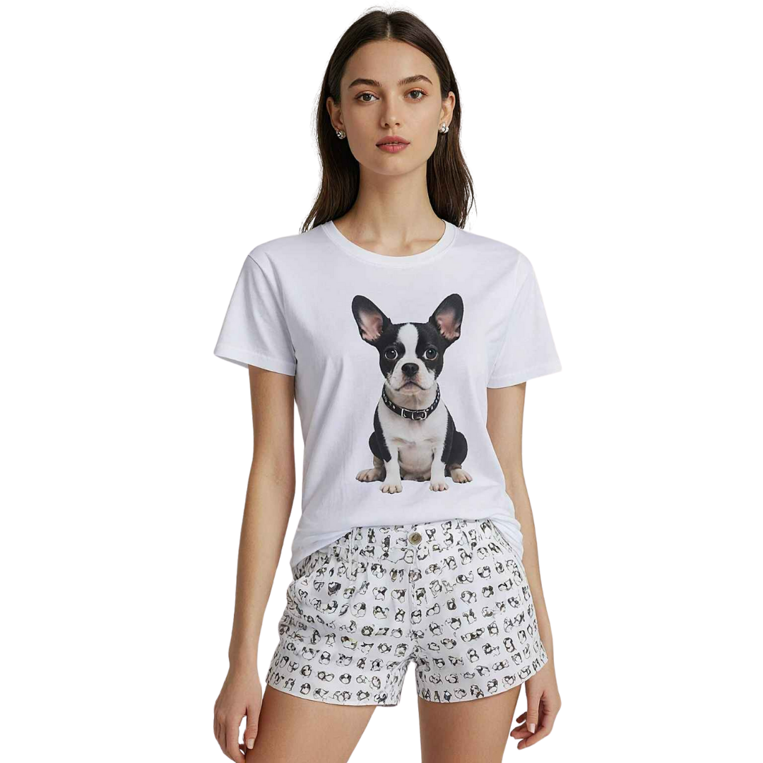 Conjunto Joint I - Este conjunto descontraído e divertido é perfeito para um dia relaxante. A camiseta branca de algodão é estampada com a imagem fofa de um cachorro, trazendo um toque de personalidade ao look. O short acompanha a temática canina, com uma estampa repleta de pequenos cachorrinhos coloridos em tons suaves, oferecendo conforto e estilo ao mesmo tempo. Ideal para momentos de descanso, como em casa ou durante um passeio casual, este conjunto combina praticidade e um toque de charme lúdico.
