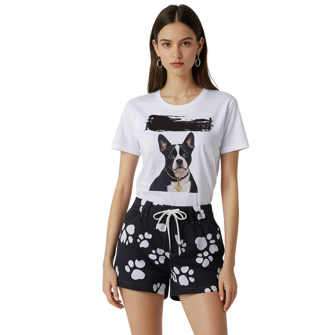 Conjunto Joint III - Esse conjunto traz uma proposta divertida e casual, com uma camiseta branca estampada com a imagem de um cachorro Boston Terrier, adicionando uma dose de simpatia ao visual. O detalhe da faixa preta sobre a estampa dá um toque contemporâneo e estiloso. Para complementar, o short preto com estampa de pegadas de cachorro em branco harmoniza com a camisa, criando uma combinação divertida e descontraída. Com cordão ajustável no cós, o short oferece conforto e praticidade. Esse look é ideal para um passeio no parque ou momentos de lazer com muito estilo.