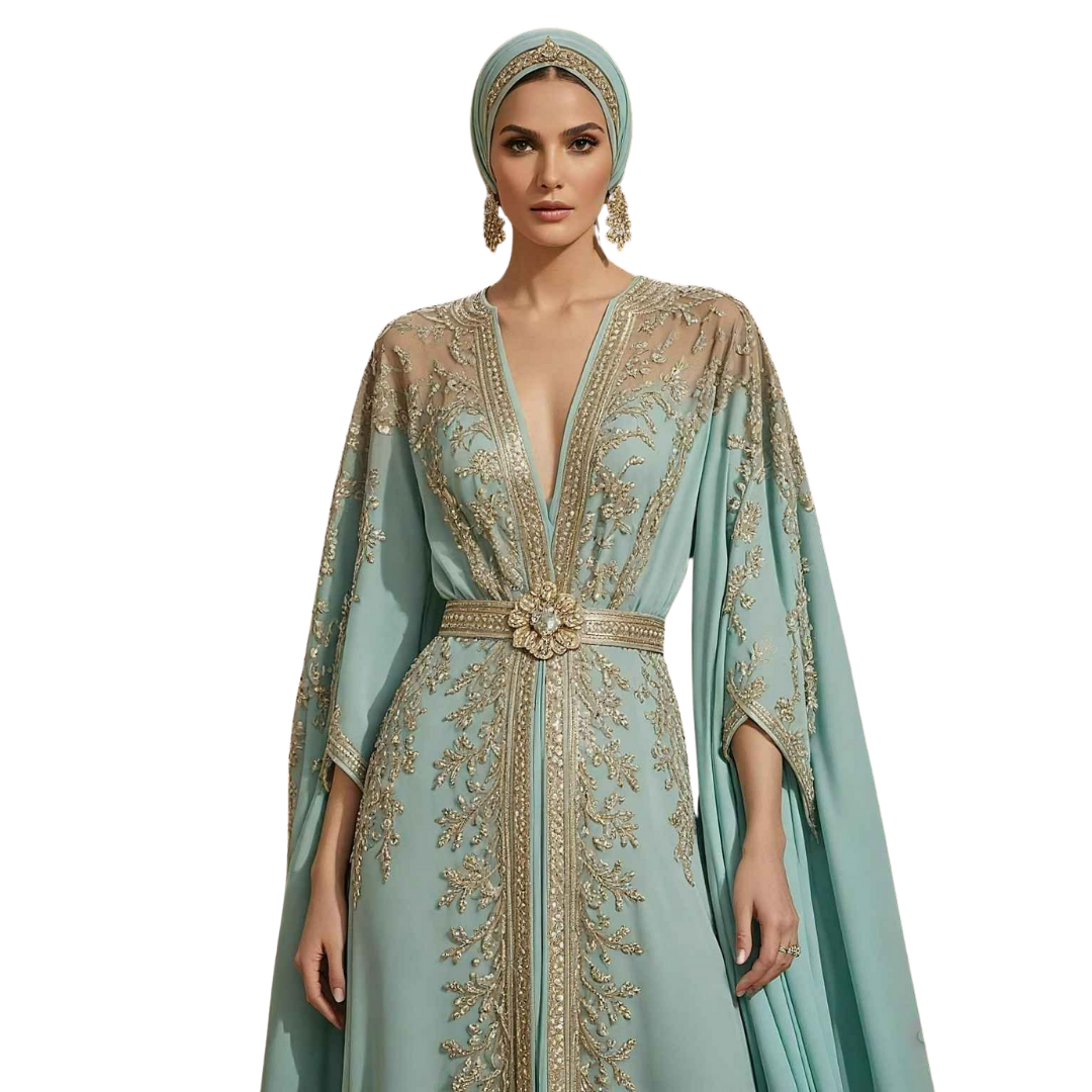 O decote em "V" confere um toque ousado, equilibrado pelos finos detalhes de bordado que desenham delicados motivos florais e arabescos dourados, criando um contraste perfeito entre a simplicidade do tecido liso e a riqueza dos ornamentos. As mangas são amplas, com um corte de caftan tradicional que proporciona um movimento elegante ao caminhar. O vestido é finalizado com um cinto dourado ornamentado, com um broche floral no centro, que destaca a cintura e adiciona uma dose de glamour ao conjunto.