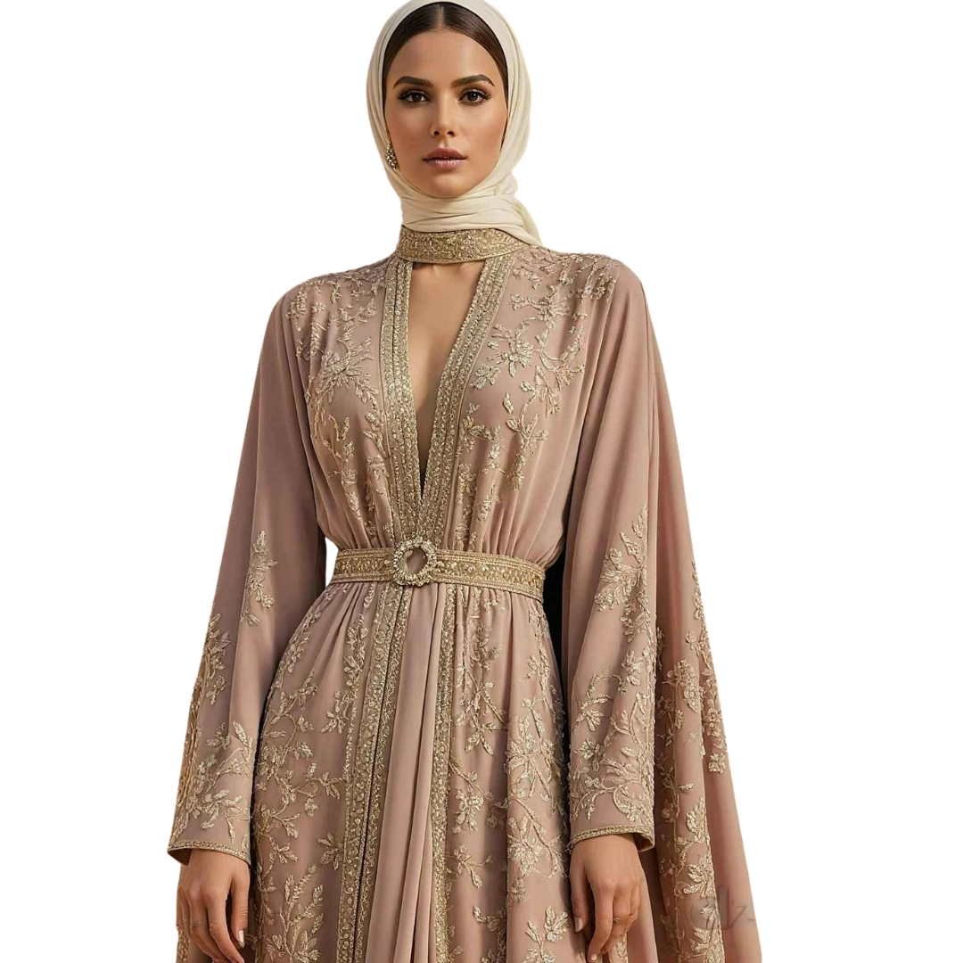 Este vestido em tom nude rosado é um exemplo de delicadeza e elegância na moda árabe. Feito de um tecido fluido e leve, ele apresenta bordados dourados sofisticados que desenham padrões florais em toda a extensão da peça, desde o decote até as mangas longas e esvoaçantes.