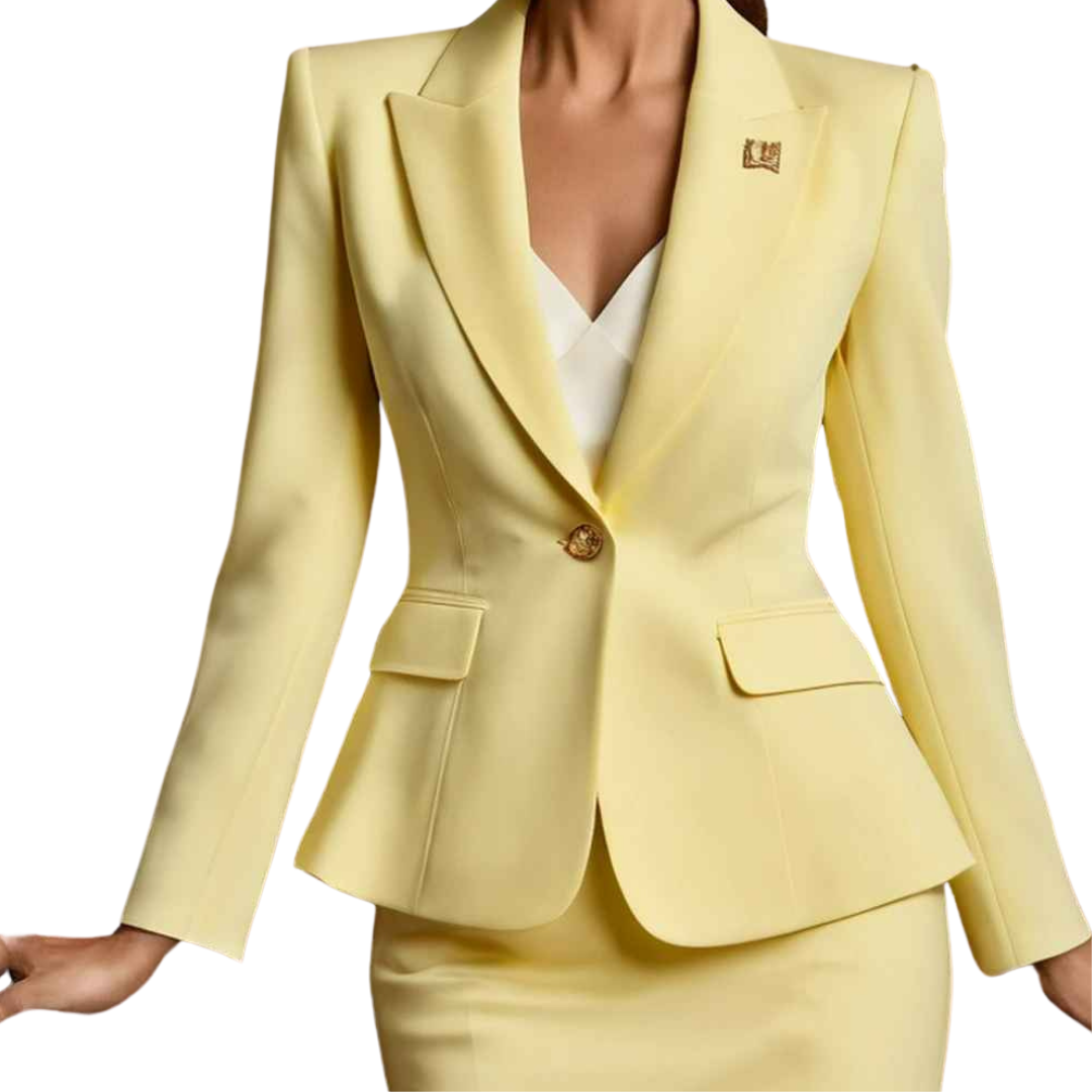 Tailleur Gentle - Este conjunto é composto por um blazer e uma saia, ambos em um tom suave de amarelo claro. O blazer apresenta um corte estruturado, criando uma silhueta ajustada e sofisticada. A lapela é de estilo clássico, com linhas bem definidas que acentuam a elegância da peça. O blazer é fechado por um único botão dourado, localizado na cintura, que é levemente cinturada para realçar a forma do corpo.